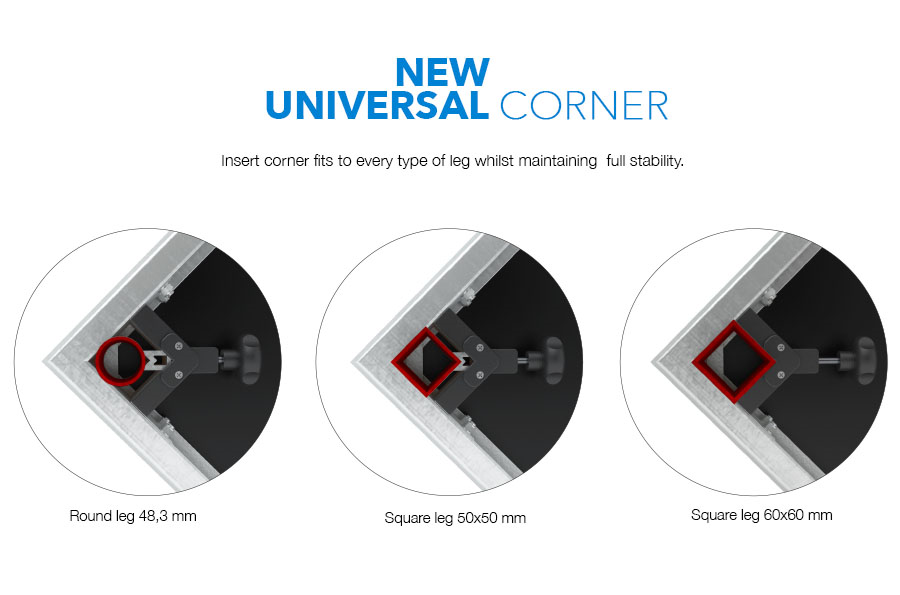 The platforms are based on light and specially designed aluminium sction by means of which platforms are joined together into the desired shape. All platforms accessories (self-levellin insert, barrier clamps, stairs clamps or assembly insert which can be used to hang curtains or advertasing banners) are fastened to the section.