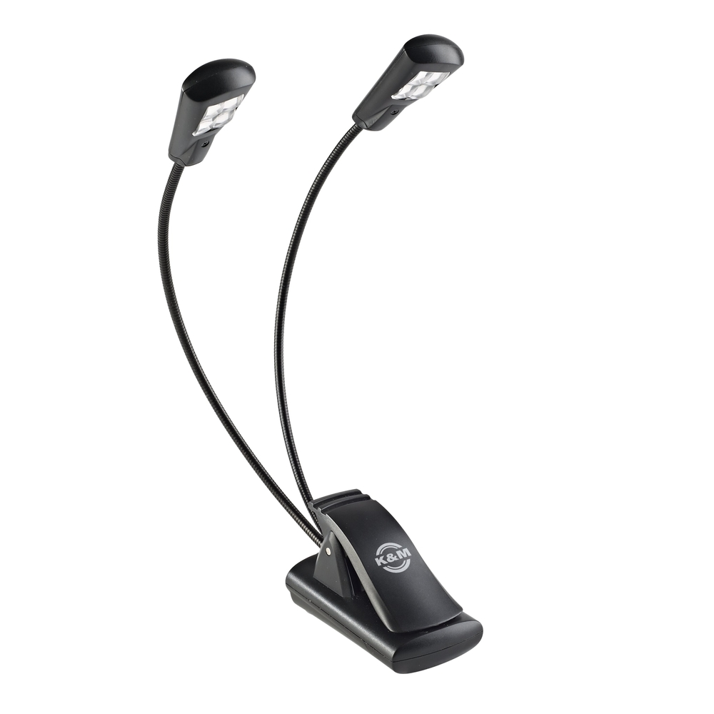 Powerful and multifunctional dual-headed light with 2 flexible goosenecks which allow the musician to focus light to a pinpoint or evenly over a larger area. The light provides comfort and versatility to accommodate a variety of lighting needs through 4 powerful LEDs rated for 100,000 hours on each head and two brightness settings. The latest LED technology guarantees a bright light source and minimal energy consumption. A practical and extra-wide clip provides for easy attachment to all music desks or table tops with a thickness of 25 mm. The light is powered by 3 (1.5 V AAA) batteries (included) with a typical battery life of 10 hours. Powered also by AC adapter (not included).